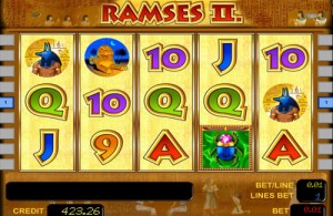 Wie bei zahlreichen Automaten von Novoline besteht Ramses 2 aus grundlegenden Gewinnsymbolen zwischen Zehn und Ass, ebenso wie Sondersymbole aus der jeweiligen Themenwelt. Wer auf höhere Multiplikatoren bei seinen Drehs wartet, sollte Ausschau nach Kamelen, Edelsteinen und anderen Sonderzeichen halten, die nicht nur zur Zeit des Pharaos Ramses den Charme des Alten Ägyptens ausgemacht haben. Der Pharao erscheint natürlich auch selbst auf den fünf Walzen und wird als Wild-Symbol eingesetzt, d. h. er ersetzt alle Symbole, die zu einem Gewinn in einer der aktivierten Paylines fehlen. Ebenfalls reizvoll ist der Skarabäus, der wenigstens dreimal in beliebiger Position erscheinen sollte, um als Scatter zu fungieren. Dieser bietet nicht nur 15 Freispiele, sondern verdreifacht auch den in Free Spins erzielten Gewinn. Mit Ramses erzielte Gewinne werden hingegen grundsätzlich verdoppelt.